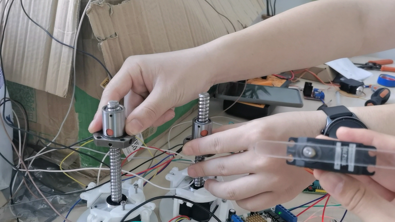 还有工业机器人专业的彭浩然,虽然没有参与机创比赛,但他对51单片机的编程兴趣浓厚。在陈雨熹的邀请下,彭浩然不计辛劳的帮助小组同学,为机创作品进行编程调试。反反复复经历多次失败,但没有让他退缩,不断的尝试,无数次的调整,最终,换来了满意的结果。电机的转动、丝杆的升降终于完全达到预期的要求。