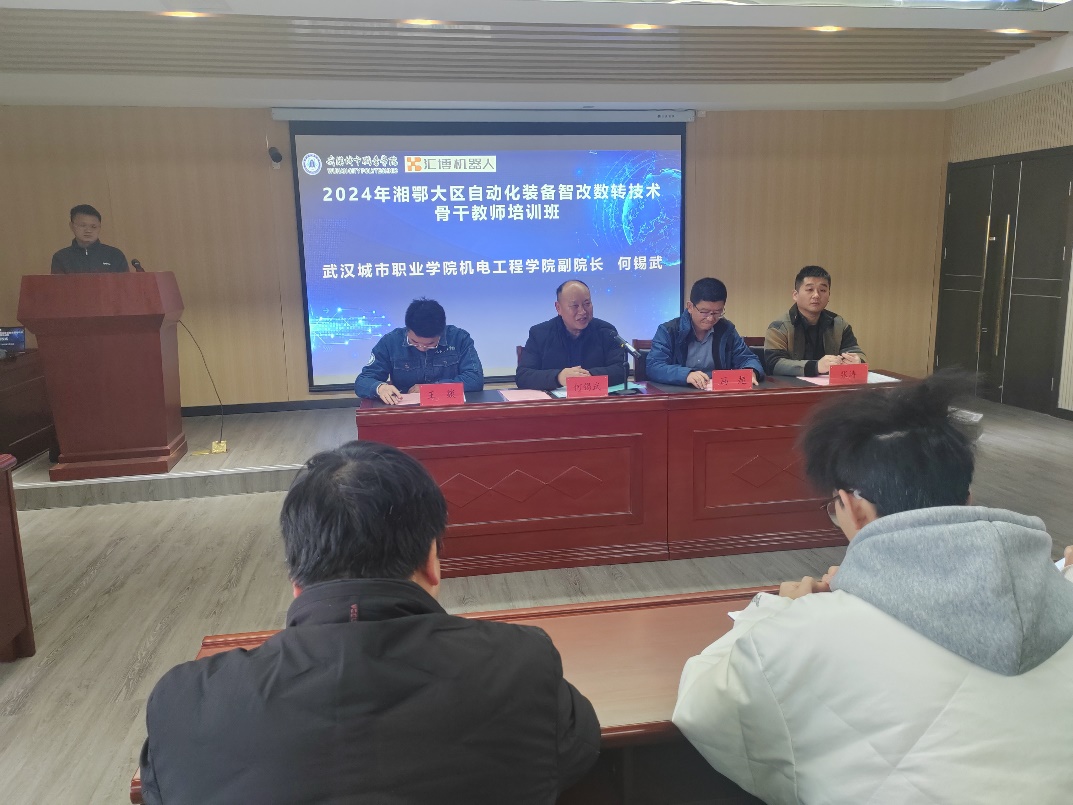 3月10日,2024年湘鄂大区自动化装备智改数转技术骨干教师培训班在武汉城市职业学院机电工程学院召开。江苏汇博机器人技术股份有限公司副总裁冯超、武汉咚咚英才教育科技有限公司总经理 张涛、武汉城市职业学院机电工程学院副院长何锡武、王燚参加了此次开班仪式,会议由江苏汇博机器人技术股份有限公司区域经理郑亮主持。