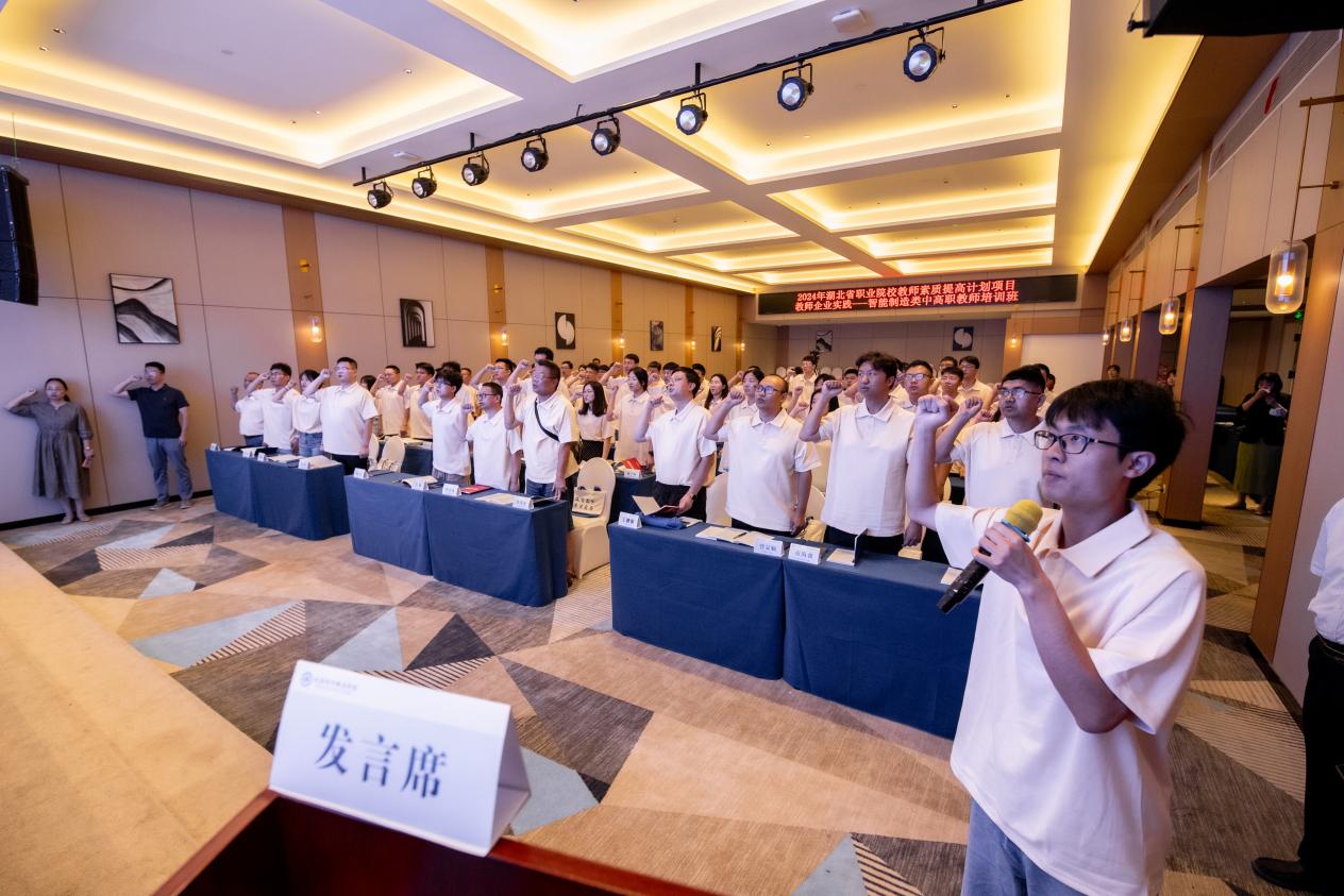 开班仪式的高潮部分是学员集体宣誓环节。由湖北城市职业学校的杨光老师作为学员代表领誓,全体参训教师庄严宣誓,承诺将严格遵守培训纪律,认真学习,不断提升自我,为培养新时代的技术技能人才而努力奋斗。
