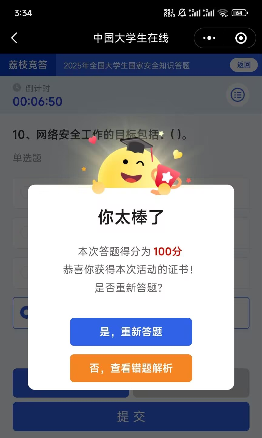 为检验学习成效,学院于4月10-19组织全体学生参加“全国大学生国家安全知识答题”。本次竞赛依托教育部“中国大学生在线”平台,聚焦总体国家安全观、保密法规、科研数据防护、网络安全攻防等核心领域,设置“单选快答”“多选辨析”“案例研判”三类题型。活动期间,学生们以班级为单位组建“安全卫士战队”,展现出极高的参与热情和团队协作精神。各战队采用“每日答题打卡+错题攻坚研讨”的创新模式展开激烈角逐。每日答题打卡环节,同学们争分夺秒,形成了一股你追我赶、互不相让的学习热潮。