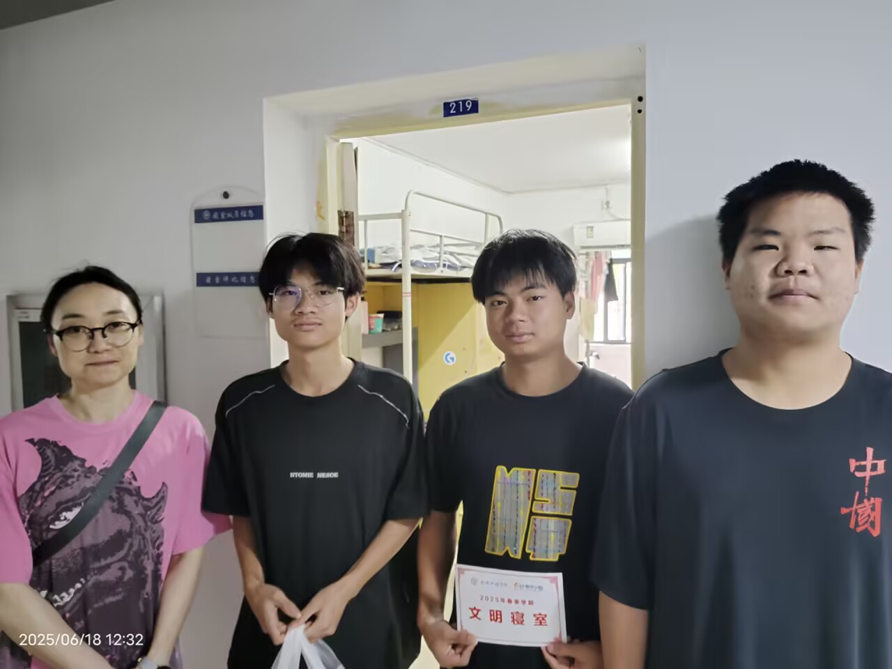 本学期,机电工程学院继续深化寝室文明建设,每月坚持开展细致的查寝工作,对寝室的卫生状况、纪律遵守、文化氛围营造等方面进行了全面而深入的评估。经过数月的严格筛选与综合评定,一批寝室脱颖而出,获评了“2025年春季学期文明寝室”的荣誉称号,他们以实际行动诠释了文明寝室的内涵,展现了机电工程学院学子的良好风貌。6月18日中午,学院领导、班主任及辅导员老师齐聚一堂,共同为这些荣获文明寝室称号的宿舍举行了挂牌仪式,并颁发了精心准备的奖品。